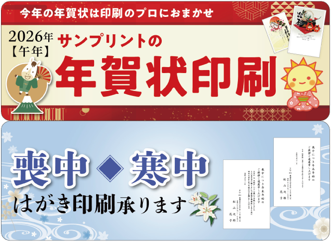 年賀状、早めにご準備しませんか? サンプリントでも年賀状印刷承ります(^^) 年賀はがきの販売は、11月1日(金)~始まります! はがき自体は持ち込んでいただいても、 弊社でご準備することも可能です。 お気軽にお申し付け